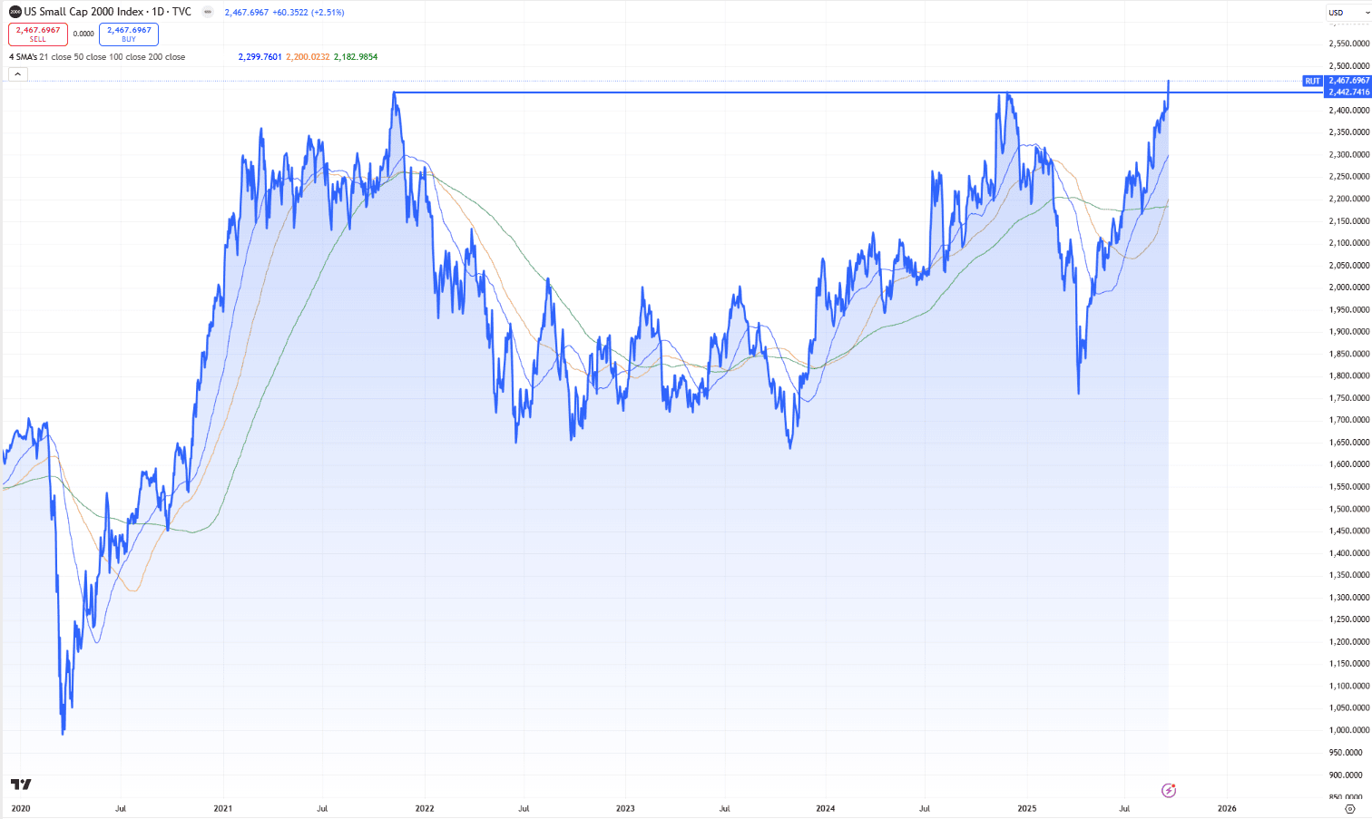 La sostenibilità di questo rally dipenderà ora da fattori ben precisi. Se i tagli della Fed proseguiranno e la crescita resterà stabile, le small cap avranno margine per continuare a correre. Un soft landing potrebbe trasformare il nuovo massimo in un punto di svolta strutturale. Al contrario, un ritorno dell’inflazione o una stretta monetaria improvvisa rischierebbero di frenare l’indice, data la sua sensibilità al costo del capitale.
