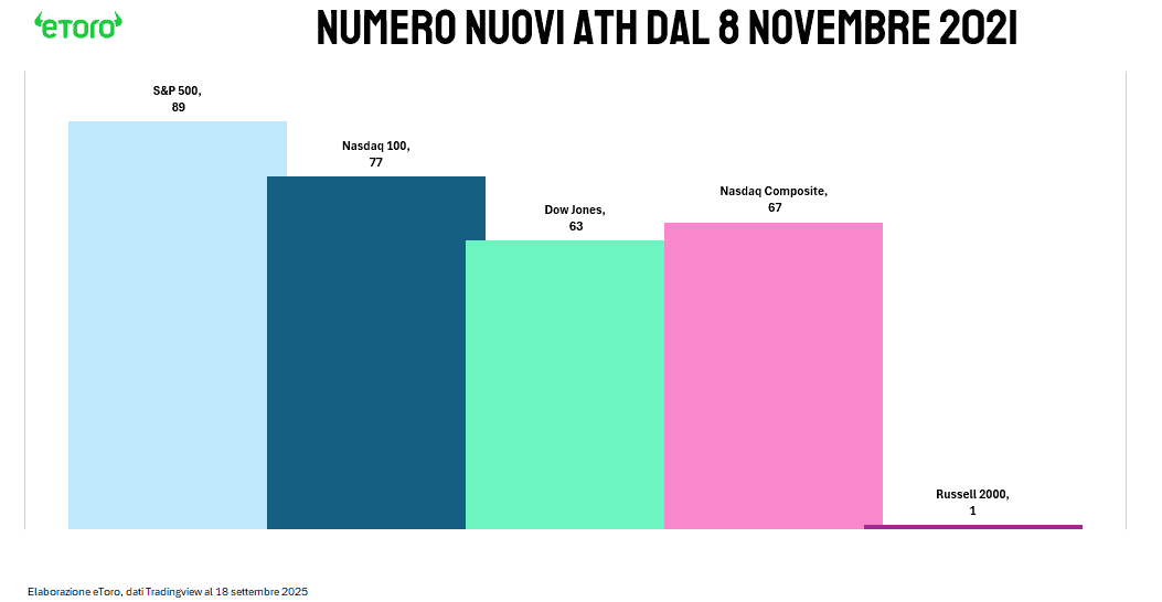 I numeri sui massimi storici confermano il divario. Dal post 8 novembre 2021, come detto, ultimo massimo storico del Russell 2000, lo S&P 500 ha aggiornato 89 volte i propri record (57 nel solo 2024 e già 26 nel 2025), il Nasdaq 100 77, il Dow Jones 63, il Nasdaq Composite 67. Il Russell 2000, invece, era rimasto fermo: nessun nuovo massimo per quasi quattro anni, fino al segnale di oggi. Non è quindi un traguardo qualsiasi: è la fine di un lungo silenzio.
