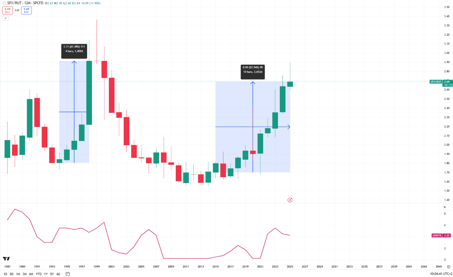 Il grafico di lungo periodo del rapporto SPX/RTY, ovvero tra Large Cap e Small Cap, rende ancora più chiaro il contesto. Dagli anni ’80 a oggi, la traiettoria mostra fasi alterne di dominio delle large cap e momenti di riequilibrio a favore delle small cap. Negli ultimi dieci anni, però, la sproporzione si è fatta estrema: +58% a favore dello S&P rispetto al Russell. Un livello che ricorda gli eccessi degli anni ’90 e che segnala quanto il mercato abbia puntato in modo quasi esclusivo sulle grandi capitalizzazioni, lasciando indietro le small cap. Il nuovo massimo del Russell 2000 arriva dunque proprio nel momento in cui il rapporto tra large e small cap si trova su livelli storicamente sbilanciati.