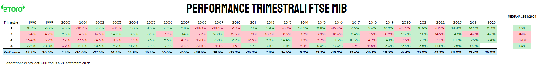 Il trimestre consegna un verdetto ancora più eloquente: FTSE MIB +7,4%, quinto trimestre di fila in rialzo. L’unico record rimasto da battere è quello dei sei consecutivi, visti nel 2006 e replicati nel 2024. Un dato che si confronta con una mediana storica di -1,1% nello stesso periodo (1998-2024). Da inizio anno l’indice segna +25%, con ogni trimestre chiuso in progresso. È accaduto solo nel 2005, 2017, 2021 e 2023. E tranne che nel 2017, il rally ha continuato anche nel quarto trimestre.