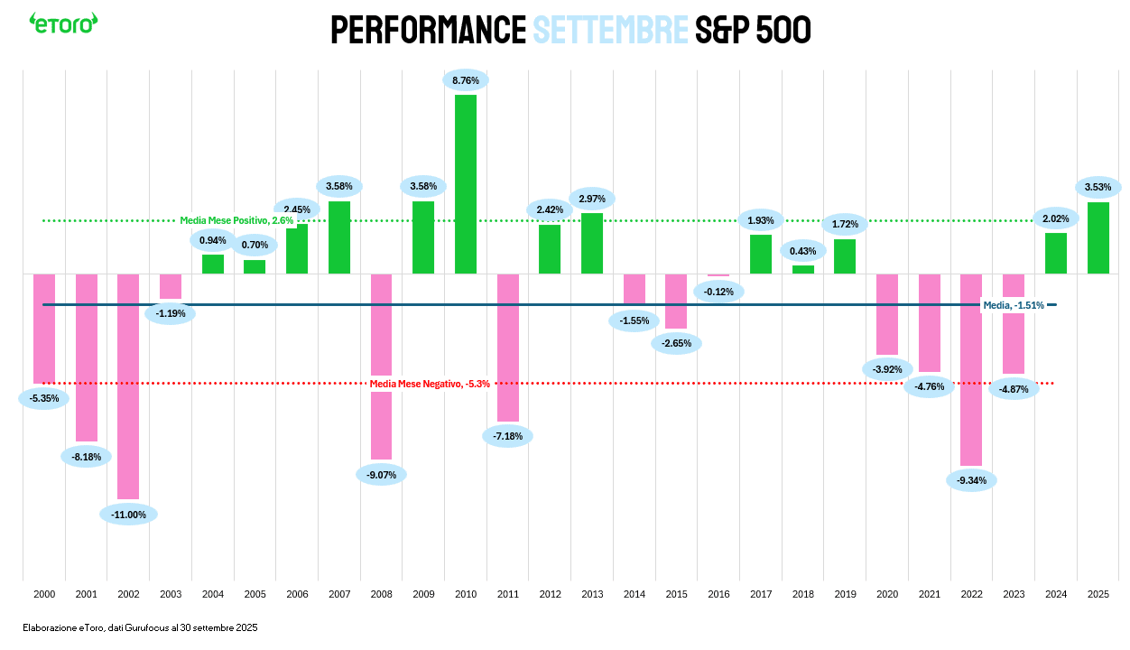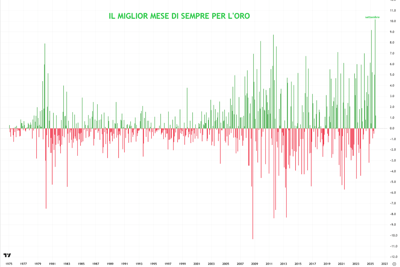 Lo S&P 500 non è da meno: +3,53% a settembre, il miglior risultato dal 2010, e un trimestre chiuso a +7,79%, il migliore dal 2020, con cinque mesi consecutivi in progresso.