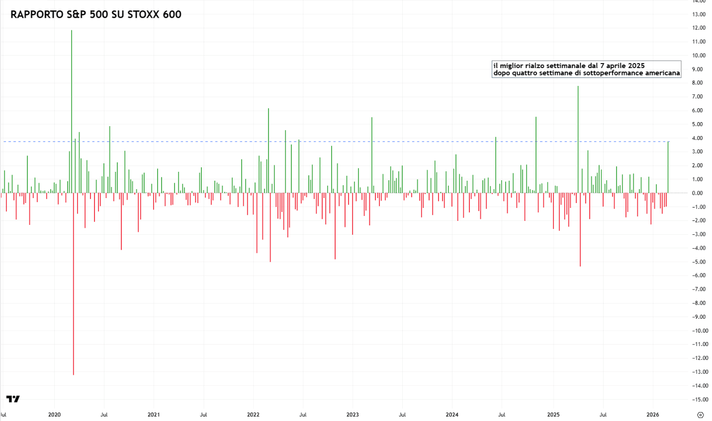 Ed è proprio in questo contesto che gli Stati Uniti confermano il loro ruolo di rifugio relativo del capitale globale. Il rapporto S&P 500 / STOXX 600 rimbalza del 3,74%, il miglior rialzo settimanale dal 7 aprile 2025, dopo quattro settimane consecutive di sottoperformance americana. Mentre il mondo vende rischio, il capitale continua a cercare negli Stati Uniti un approdo meno fragile.