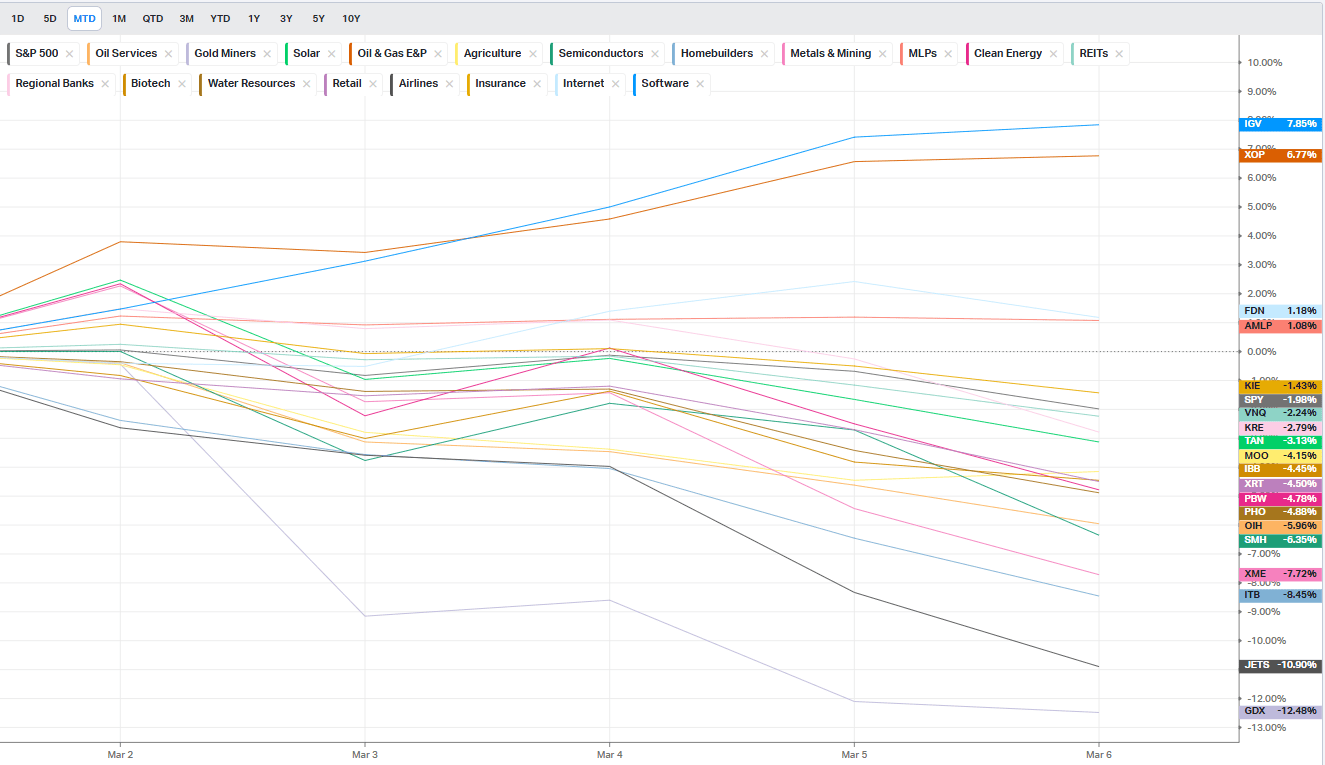 Proprio il segmento più affollato e più venduto negli ultimi mesi riesce a sfuggire alla pressione delle vendite. L’ETF IGV guadagna il 7,85%, la miglior performance settimanale dal 21 aprile 2025, con tutte e cinque le sedute in rialzo. Un movimento che sorprende soprattutto perché arriva dopo settimane di de-grossing massiccio nel settore tecnologico. Il report di Goldman Sachs lo conferma: i titoli di tecnologia, media e telecom hanno registrato la più ampia riduzione dell’esposizione lorda da luglio 2024, guidata proprio dalle chiusure di posizioni corte nel software. Nello stesso tempo gli short sugli ETF americani sono aumentati dell’8,3% nella settimana, il secondo incremento più forte degli ultimi cinque anni, subito dopo il Liberation Day. L’effetto Anthropic/Citrini aveva esposto la vulnerabilità del software all’intelligenza artificiale. La guerra, paradossalmente, l’ha temporaneamente “salvata” attraverso le chiusure di posizioni corte.