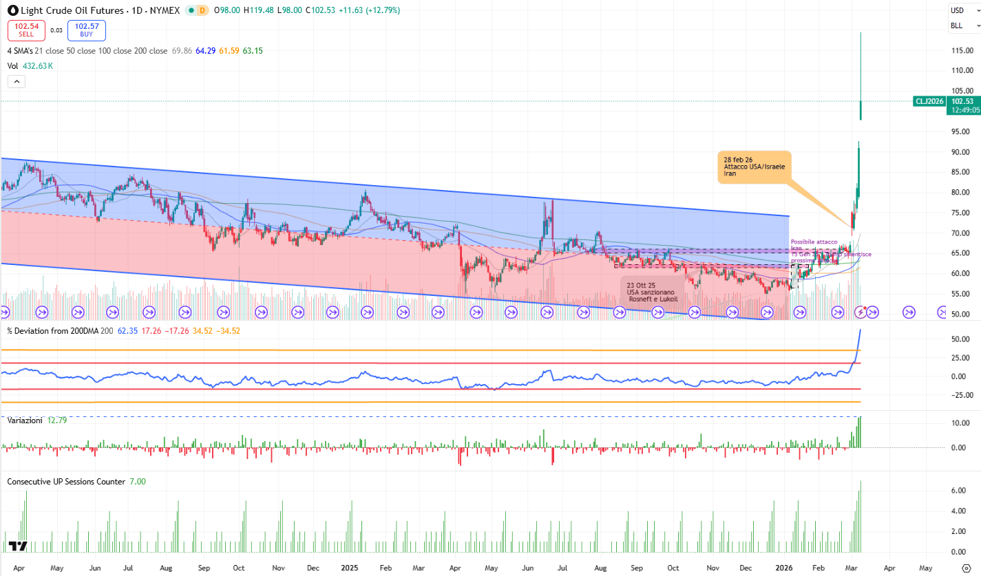 Il grafico del WTI rafforza questa lettura. L’accelerazione quasi verticale dei prezzi, la rottura netta del canale discendente, variazioni giornaliere ben oltre la media e una sequenza di sette sedute consecutive in rialzo raccontano un mercato entrato in fase di strappo. La distanza sempre più ampia dalla media di lungo periodo non è solo un dettaglio tecnico: è il segnale di un movimento alimentato allo stesso tempo da dinamiche di mercato, tensione emotiva e pressione geopolitica.