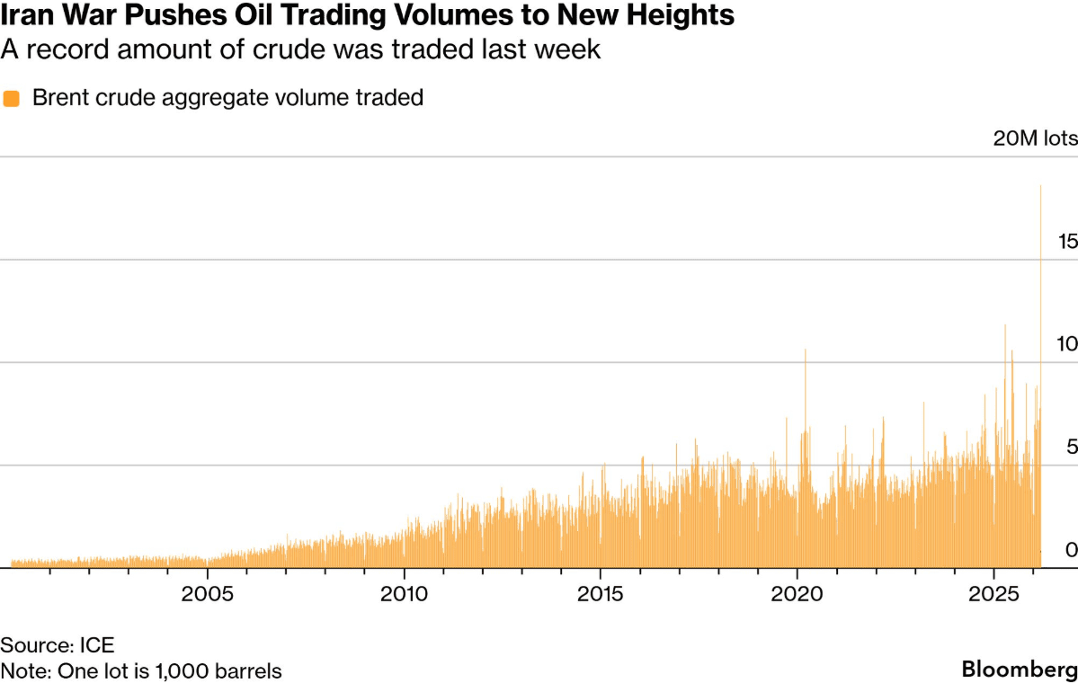 In questo quadro il petrolio diventa il vero barometro della tensione. Il Brent ha aperto la settimana registrando un picco intraday di 119,50 dollari, superando la soglia dei 100 dollari per la prima volta dal 2022. Il mercato non sta più prezzando una tensione temporanea, ma la possibilità di un’interruzione prolungata dei flussi energetici globali. Ancora più impressionanti sono i volumi. La scorsa settimana sul Brent sono stati scambiati oltre 18,6 milioni di lotti, pari a 18,6 miliardi di barili, circa sei mesi di consumo globale. Nella sola seduta odierna erano già passati di mano quasi 900.000 lotti, oltre tre quarti della media giornaliera dell’ultimo anno. Il mercato non sta solo reagendo. Sta cercando prezzo, copertura e direzione.