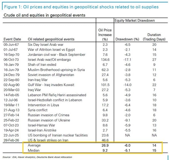 Il motivo è evidente. Il petrolio è tornato a muoversi con la velocità tipica delle crisi geopolitiche. A fine febbraio il Brent viaggiava intorno ai 72 dollari al barile. Oggi si muove sopra 104 dollari. In poche settimane il mercato ha quindi prezzato un rialzo superiore al 45%. È un movimento forte anche in prospettiva storica. Guardando agli shock geopolitici legati al petrolio dal 1967 a oggi, il rialzo mediano del greggio nelle prime fasi delle crisi è stato intorno al 30%, mentre il drawdown medio dell’S&P 500 si è collocato in area -5%/-6%, con una durata mediana di circa 15 sedute. Oggi il Brent si è mosso più rapidamente della storia recente, mentre l’azionario americano, con un calo di circa -3,6% in dieci sedute, sta ancora reagendo in modo più composto.