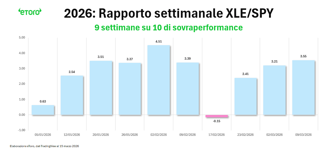 Il primo effetto visibile è la rotazione settoriale. Dall’inizio del mese l’energia è l’unico settore dell’S&P 500 in territorio positivo. Il rapporto tra XLE e SPY ha raggiunto nuovi massimi annuali, con l’ETF energetico che ha sovraperformato l’indice generale in 9 delle prime 10 settimane del 2026 e ha messo insieme 12 settimane consecutive di rialzo, la serie positiva più lunga dalla sua nascita. Ma proprio qui emerge una differenza strutturale importante rispetto al passato: oggi XLE pesa appena il 3,67% dello S&P 500. Negli anni Settanta, o anche durante la prima guerra del Golfo, il settore energetico aveva un peso molto più rilevante nella composizione dell’indice. Questo significa che uno shock petrolifero colpisce meno direttamente il listino americano, ma può influenzarlo molto di più attraverso i canali indiretti, inflazione, politica monetaria, costo del capitale e aspettative di crescita.