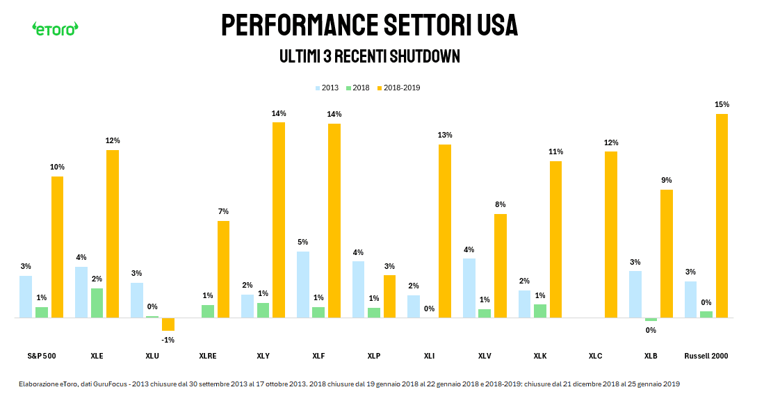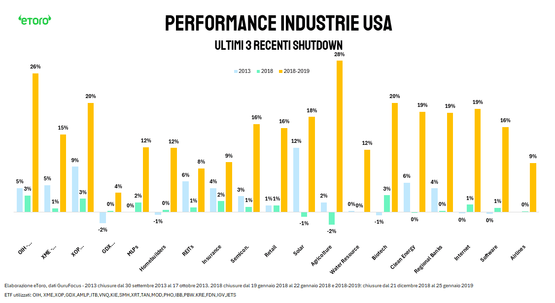 Il quadro diventa più interessante se ci concentriamo sugli ultimi tre shutdown per i quali abbiamo dati completi, sia a livello di indice che di settori e industrie. Nel 2013, con 17 giorni di stallo, lo S&P 500 guadagnò il 3% e i rialzi furono diffusi: i finanziari salirono del 5%, l’healthcare del 4%, mentre a livello industriale spiccò il solare con un sorprendente +12%. Fu la dimostrazione che, in un contesto macro favorevole, il mercato riesce a guardare oltre lo scontro politico. Nel gennaio 2018, con un blocco di soli tre giorni, l’impatto fu minimo: l’S&P 500 si mosse appena dell’1% e i settori rimasero sostanzialmente piatti, senza segnali particolari a livello industriale. Tutto cambiò invece tra dicembre 2018 e gennaio 2019, durante lo shutdown più lungo della storia (35 giorni). In quel caso l’indice guadagnò il 10% e i settori ciclici esplosero: energia +12%, industriali +13%, comunicazioni +12%. Ma furono soprattutto le industrie a dare la misura del rally: semiconduttori e software +16%, oil services +26%, metal & mining +15%, acqua +28%. Un’accelerazione che non derivava dallo shutdown in sé, ma dal cambio di rotta della Federal Reserve, che dopo il sell-off di fine 2018 abbandonò la linea restrittiva per tornare su posizioni accomodanti.