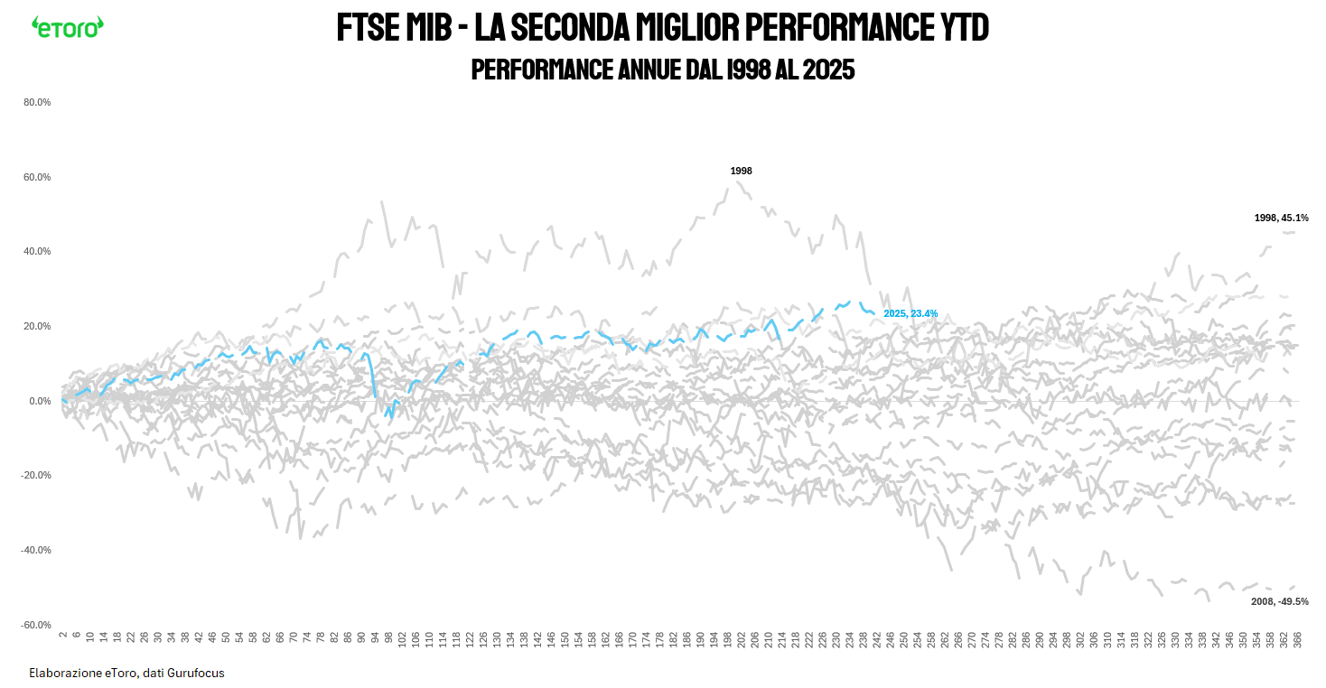 Agosto si è chiuso con un bilancio che conferma la forza straordinaria di Piazza Affari. Il listino ha guadagnato un +2,95%, portando il 2025 a +23,43%, miglior progressione dall’inizio del secolo e secondo solo al 1998. Un risultato di rilievo, seppure offuscato dal finale di mese: -2,57% nell’ultima settimana, con quattro sedute negative su cinque. Nonostante questo, l’ampiezza del movimento resta evidente: soltanto tre titoli in rosso ad agosto (a luglio furono 21, così come a giugno furono 24) e trentuno in positivo da inizio anno (uno in più rispetto ai 30 di fine luglio).