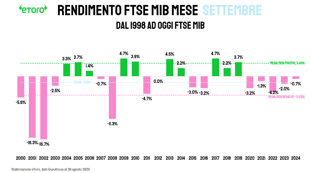 Settembre arriva con un fardello che non è solo statistico, ma anche memoria recente. Dal 1998 è il mese peggiore per Piazza Affari, con una mediana di -1,95%, e dal 2020 al 2024 ha sempre chiuso in negativo: l’ultimo segno positivo risale al 2019. Non è un dettaglio marginale. È una sequenza che pesa sulle attese e che tende a trasformarsi in profezia autoavverante.