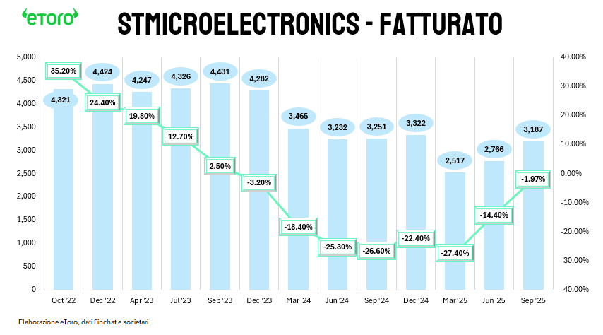 Nel terzo trimestre dell’anno, STMicroelectronics esegue. I ricavi toccano i 3,187 miliardi di dollari, leggermente sopra il punto medio della guidance. Il margine lordo si ferma al 33,2%, appena sotto il 33,5% atteso (ma all’interno dell’ampia forbice di 200 basis points), mentre il free cash flow, dopo il rosso del secondo trimestre, torna positivo per 130 milioni. Anche l’utile netto rientra in territorio positivo: 237 milioni di dollari in GAAP, 267 milioni in non-GAAP. I numeri sono allineati, l’esecuzione è pulita, ma la questione resta aperta: questa normalizzazione operativa basta a rimettere in moto una narrazione di crescita?