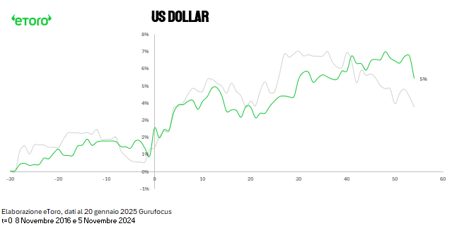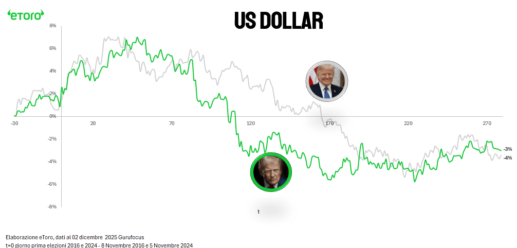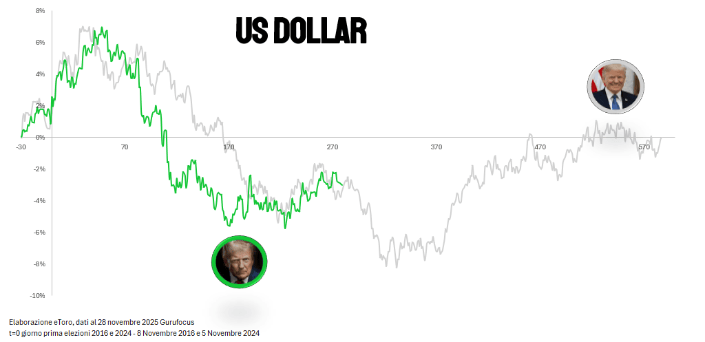 Osserviamo il cammino. Nei 30 giorni che hanno preceduto le elezioni USA del 2024 il dollaro ha imboccato un sentiero che ricorda da vicino quello del 2016, l’anno della prima vittoria di Donald Trump. Nei successivi 54 giorni post-voto si è apprezzato di circa 5 punti percentuali, come se due linee separate da nove anni finissero per rispondere allo stesso richiamo. Lo slancio pre elettorale si ripete, quasi un riflesso condizionato, ovvero quell’ottimismo elettorale che genera un impulso quasi automatico. Il mercato immagina crescita, stimoli fiscali, ritorno dell’eccezionalismo USA.