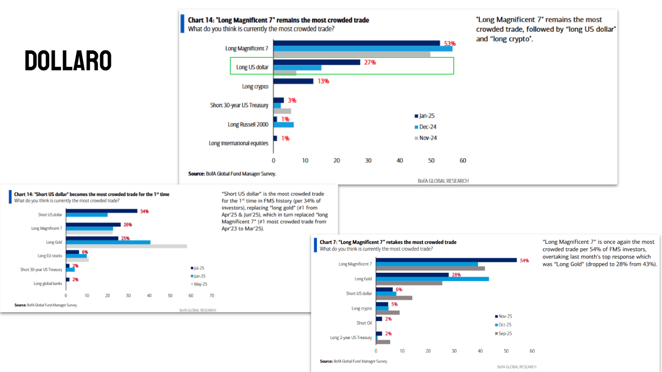 Eppure, il trade “long dollaro” era il secondo più affollato a inizio anno, secondo i sondaggi Bank of America tra i gestori. Un podio che ha vacillato e che solamente a giugno ha visto cambiare direzione a Short US dollar, e che oggi, nel report di novembre, si posiziona ancora sul podio, come terzo trade, sebbene con solo il 6%.