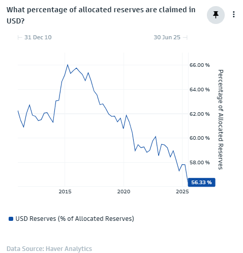 Oggi tre forze hanno orchestrato questa svolta. Prima, la geopolitica: il congelamento delle riserve russe nel 2022 aveva già incrinato la fiducia, ma i dazi del 2025 hanno amplificato il rischio politico di detenere dollari. La quota di riserve globali in USD è scivolata al 56,32% nel secondo trimestre, mentre l’oro nelle riserve centrali ha toccato massimi storici, superando il 23%, un raddoppio dal 10% del 2015. Dedollarizzazione? Forse overhyped, ma i fatti parlano: Cina e Indonesia hanno siglato accordi per settlement in valute locali, bypassando l’USD, e lo yuan ha guadagnato quota nelle riserve.