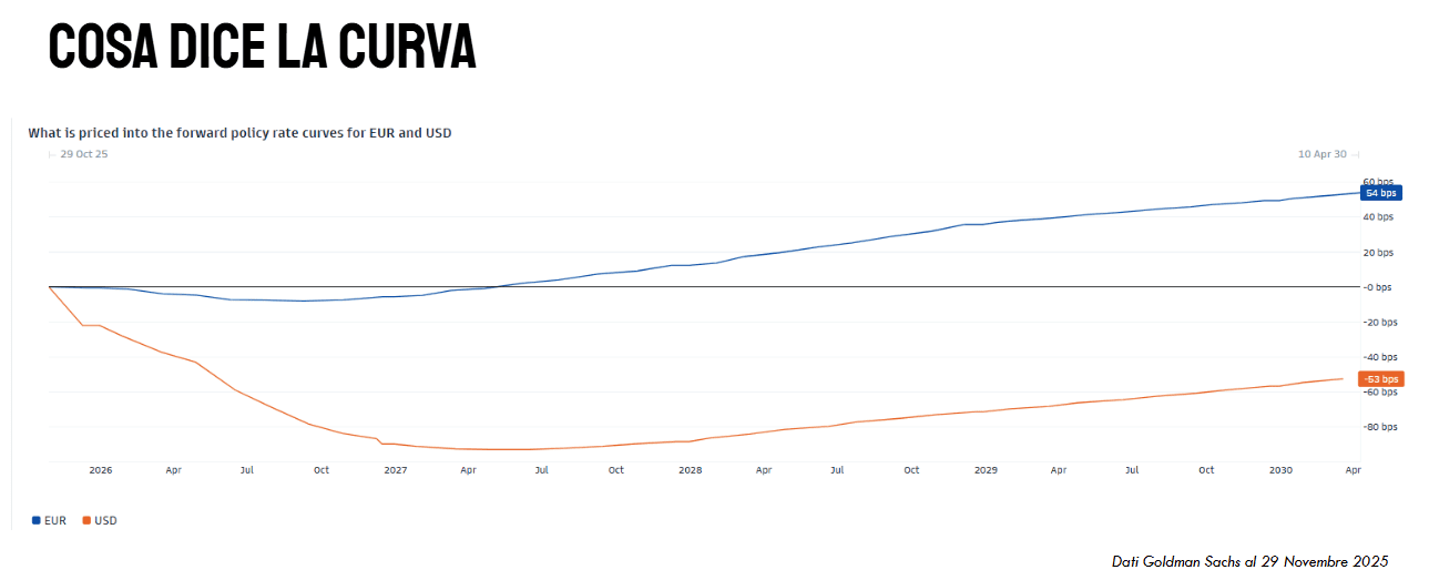 Il tutto mentre il mercato del lavoro USA perde slancio, la crescita non replica più il ritmo degli anni precedenti e le curve forward mostrano una convergenza che indebolisce ulteriormente il biglietto verde. La Fed è vista tagliare circa 53 punti base entro il 2030, mentre la BCE è attesa al rialzo di 54. Il divario che teneva forte il dollaro nel 2023-2024 si azzera, spegnendo uno dei suoi motori principali.