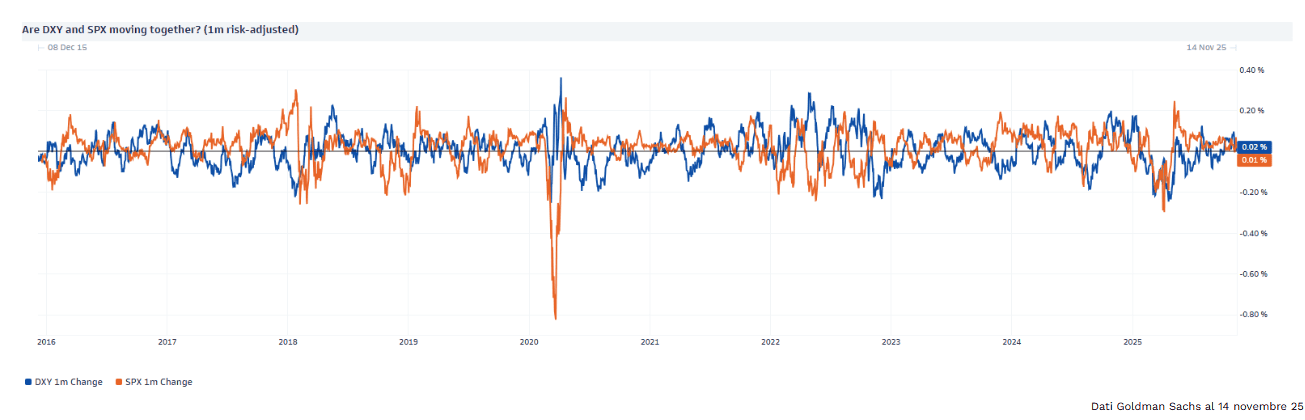C’è poi un cambiamento più profondo, visibile nei grafici della correlazione mensile tra DXY e S&P 500. Per decenni, quando la Borsa scendeva, il dollaro saliva. Era il contrappeso naturale al rischio. Oggi quel meccanismo si è spezzato. Le due curve si muovono insieme o si ignorano. Non si compensano più. Il dollaro non apre l’ombrello quando aumenta la pioggia finanziaria. Quando un asset smette di comportarsi come rifugio, significa che il premio di stabilità si sta assottigliando.