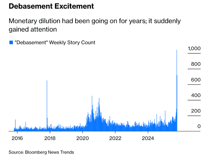 Wall Street lo chiama “debasement trade”: una fuga verso oro e asset alternativi per hedgeare l’erosione del dollaro, spinta da deficit cronici e stampa monetaria. L’idea non è nuova. Si ripresenta ogni volta che deficit elevati e politiche monetarie espansive evocano il ricordo antico delle monete “alleggerite” dai sovrani, dai clips romani alle versioni moderne del Qe. Nel 2025 questa narrativa ha trovato un’eco amplificata: le menzioni sui media sono esplose e il loro ritmo ha seguito da vicino l’accelerazione del prezzo dell’oro.