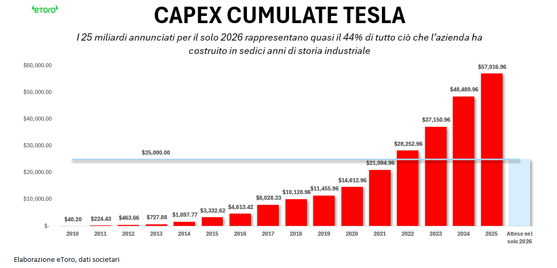 Dalla serie storica emerge un dato che dà la misura del cambio di scala. Tesla ha investito in capex circa 57 miliardi di dollari tra il 2010 e il 2025, con una vera accelerazione solo a partire dal 2021. I 25 miliardi annunciati per il solo 2026 rappresentano quasi il 44% di tutto ciò che l’azienda ha costruito in sedici anni di storia industriale. Concentrati in dodici mesi. Non è un aumento delle spese. È una compressione temporale dell’ambizione. Il confronto storico, a questo punto, perde quasi significato. Perché la Tesla che uscirà dal 2026, nel bene o nel male, sarà un’azienda strutturalmente diversa da quella che lo ha iniziato.