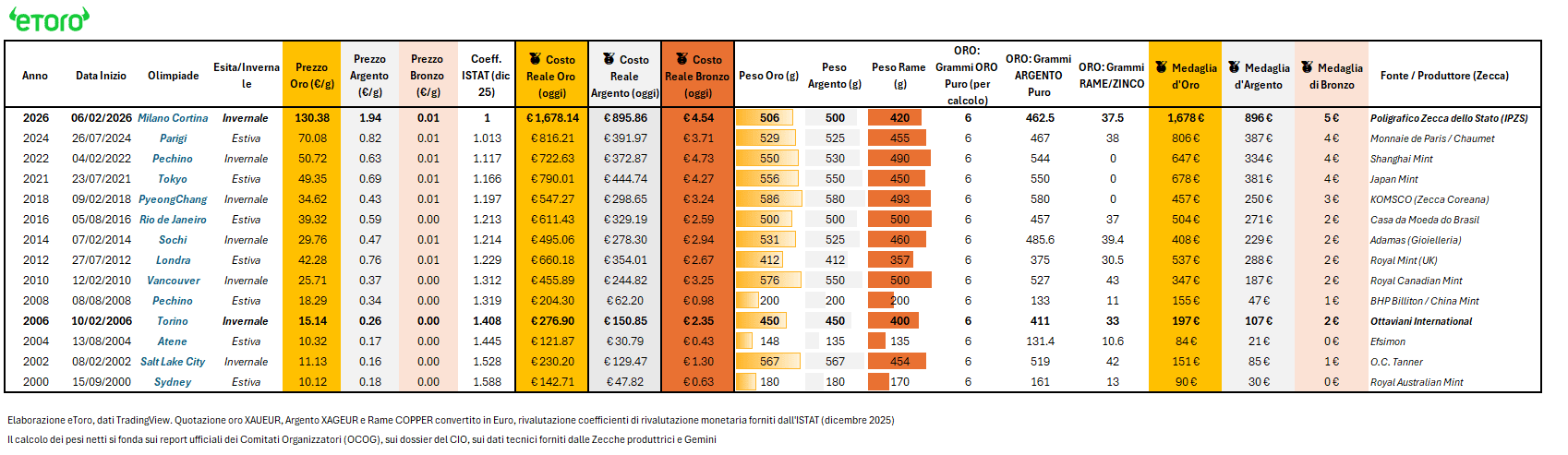Per la determinazione del costo delle materie prime sono stati utilizzati i prezzi spot di oro e argento, espressi in euro al grammo. La scelta dei prezzi spot, in luogo dei contratti futures, è stata adottata per evitare distorsioni dovute ai costi di rollover o al contango tipico dei derivati. Le serie storiche sono state estratte dalla piattaforma TradingView, identificando il prezzo di apertura della seduta di avvio di ciascuna Olimpiade. Le quotazioni originariamente espresse in once sono state convertite in grammi applicando il fattore standard di 31,1035; per il rame, componente principale delle medaglie di bronzo, è stata utilizzata la conversione libbra‑grammo pari a 453,592.