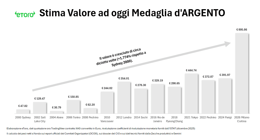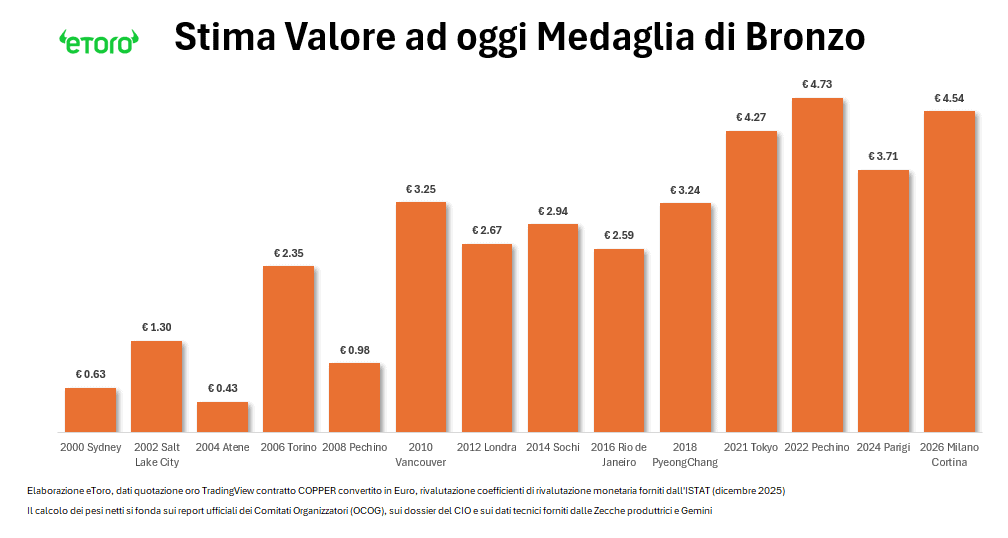Lo stesso vale per l’argento: 500 grammi quasi interamente in metallo puro, per circa 896 euro. Anche qui massimo storico. Il bronzo, 420 grammi di lega rame-zinco, vale circa 4,5 euro. Una cifra quasi simbolica, ma comunque tra le più elevate degli ultimi vent’anni semplicemente perché le medaglie sono diventate più grandi e il rame, pur senza l’esplosione dell’oro, ha mantenuto un trend rialzista strutturale.
