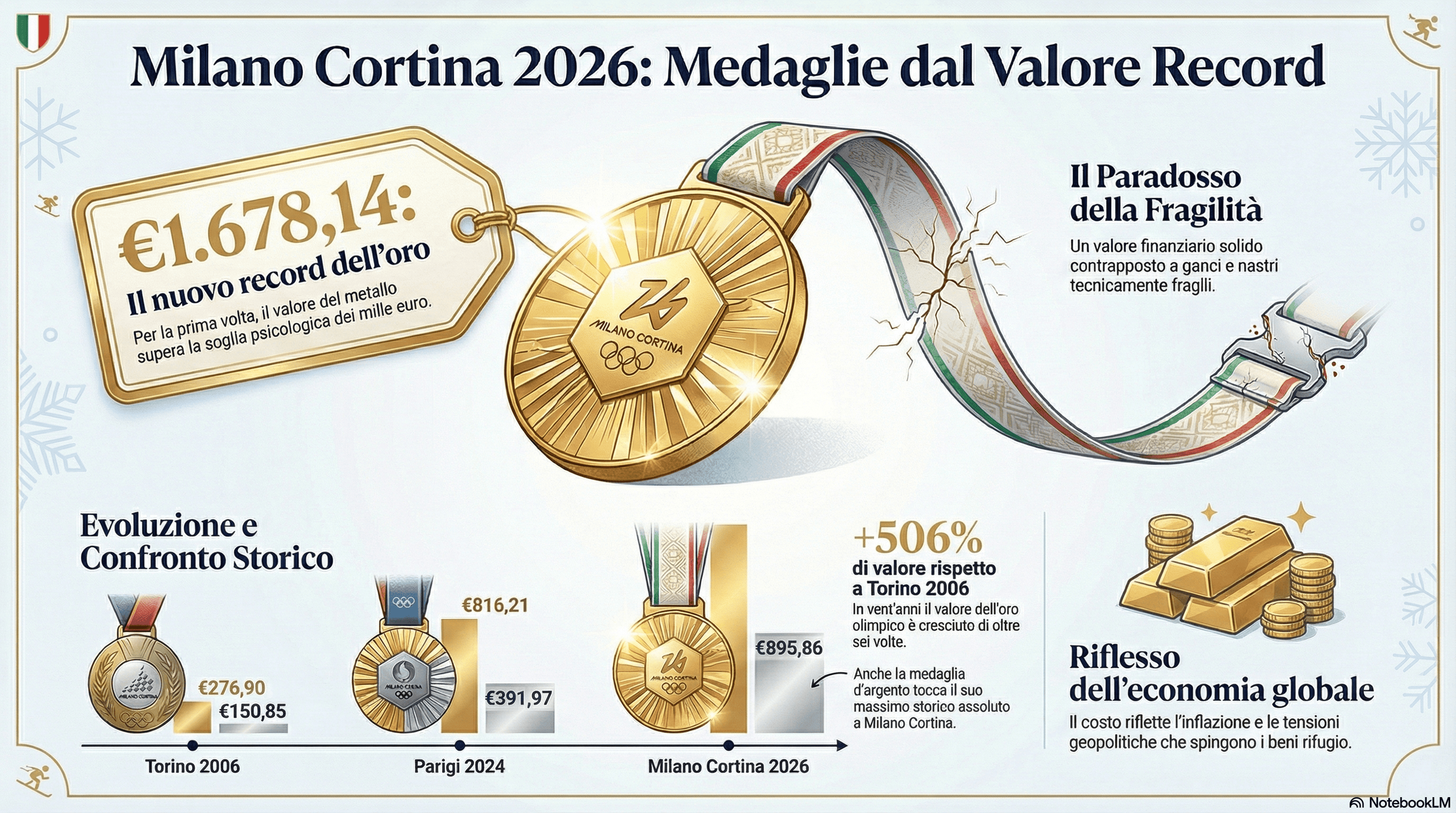 Per la prima volta l’oro olimpico supera in modo netto la soglia psicologica dei 1.000 euro di contenuto materiale. Non è solo un record contabile, è un segnale di epoca. Significa che il simbolo massimo della vittoria sportiva è diventato, tecnicamente, un piccolo lingotto travestito da trofeo.