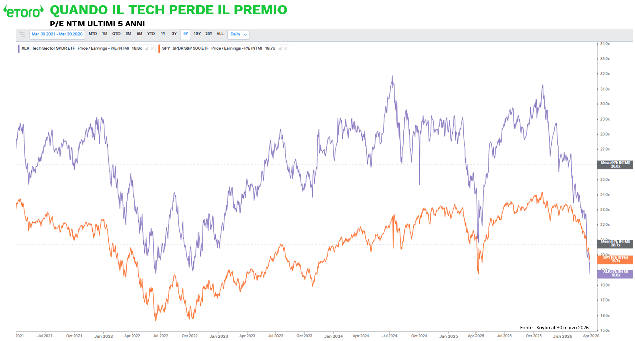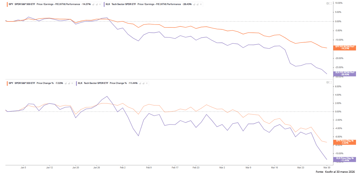 Per comprendere questa metamorfosi, bisogna guardare alla violenta contrazione dei multipli che sta oscurando la tenuta degli utili. L’S&P 500 ha perso circa il 7,3% in prezzo, ma il suo multiplo si è contratto di oltre il 14,3%. Nel settore tecnologico il movimento è stato molto più violento: prezzi in calo di circa l’11,4%, ma P/E NTM in discesa del 28,4%. Questo non è un semplice movimento di mercato. È un cambiamento nel prezzo che gli investitori sono disposti a pagare per ogni unità di utile.