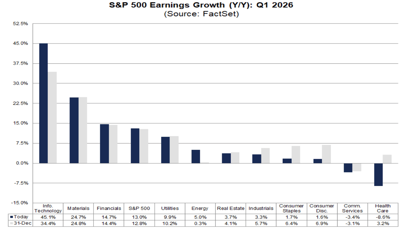 E questo accade mentre gli utili non stanno rallentando. Anzi. Le stime FactSet indicano una crescita degli utili dell’S&P 500 del 13% nel primo trimestre del 2026. Se confermata, sarebbe il sesto trimestre consecutivo a doppia cifra. Su base annua, la crescita attesa è intorno al 17,1%, con ricavi in aumento del 9,7% e margini netti al 13,2%, sopra le medie degli ultimi anni. Nove settori su undici sono attesi in crescita, e la tecnologia resta il contributore principale.