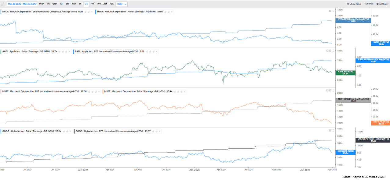 I grandi nomi della tecnologia, quelli che guidano la crescita globale, trattano oggi su multipli compressi rispetto alla loro storia. Nvidia intorno alle 19,9x, con utili attesi a 8,29 dollari per azione. Microsoft poco sopra le 20x, con EPS a 17,56. Google intorno alle 23x, con utili sopra gli 11 dollari. Numeri solidi, crescita visibile, ma multipli in contrazione. Questo è il passaggio chiave. Il mercato riconosce la crescita, ma non la paga più a premio. La considera già incorporata.