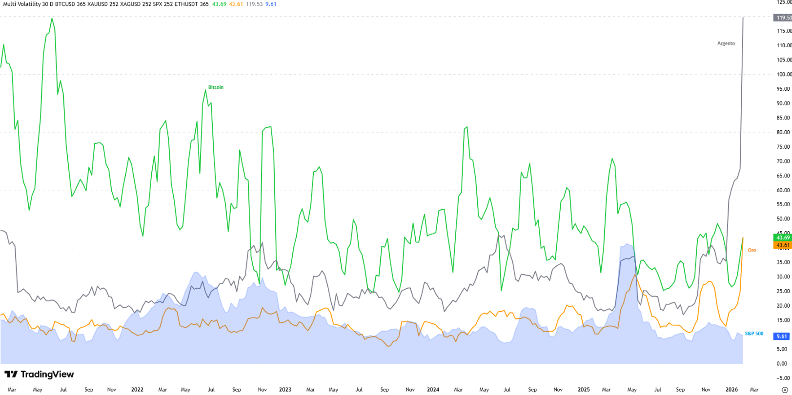 Non siamo di fronte a un Bitcoin che si calma, ma a un mondo in cui tutte le fonti di rischio si stanno riattivando. La volatilità dell’oro sale per intercettare l’incertezza macro, quella del Bitcoin sale per la correzione dei prezzi, e le due curve si toccano. Questo allineamento ci dice che la distinzione tra “asset rischioso” e “safe haven” non passa per la stabilità del prezzo giornaliero, ma per la correlazione con le crisi sistemiche. L’azionario rimane anestetizzato, mentre metalli e crypto stanno urlando che il rischio è reale, vivo e, soprattutto, volatile.