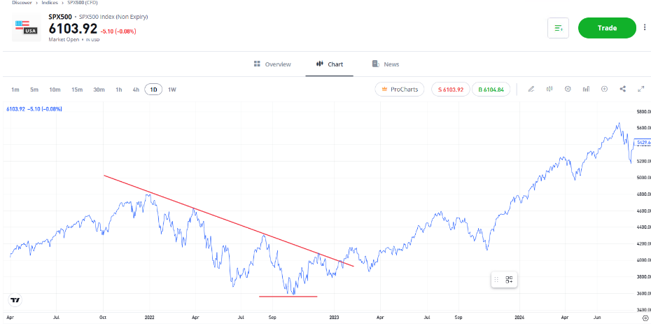 A short-lived downwards price move in an otherwise upwards trending market represents another way to buy the dip. A short-term correction in price doesn’t necessarily mean that the upwards trend has broken down, more that markets don’t move in a straight line. A situation such as this was seen during the bull market of 2024. Between the 29th October and 4th November the SPX Index fell in value by as much as 2.23% as political uncertainty about the US Presidential election weakened investor sentiment. After the 5th November election date, the market rallied to continue its upwards trend.