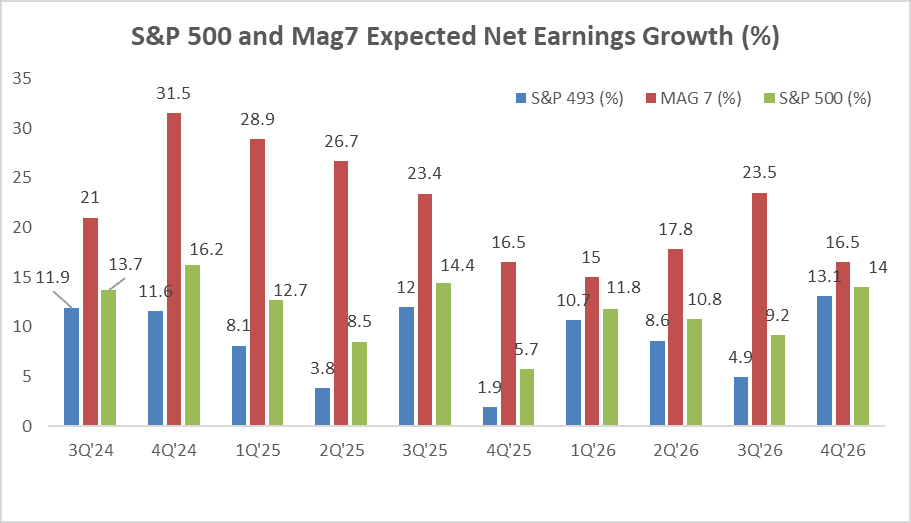 No surprise: the Magnificent Seven, Apple, Microsoft, Alphabet, Amazon, Meta, Tesla, and Nvidia, continue to dominate on both profits and performance. Their earnings growth has powered much of the S&P 500’s gains for several quarters. That said, by the second half of 2026, the gap in earnings growth between the Mag 7 and the rest of the S&P 500 (the “493”) could start to compress.