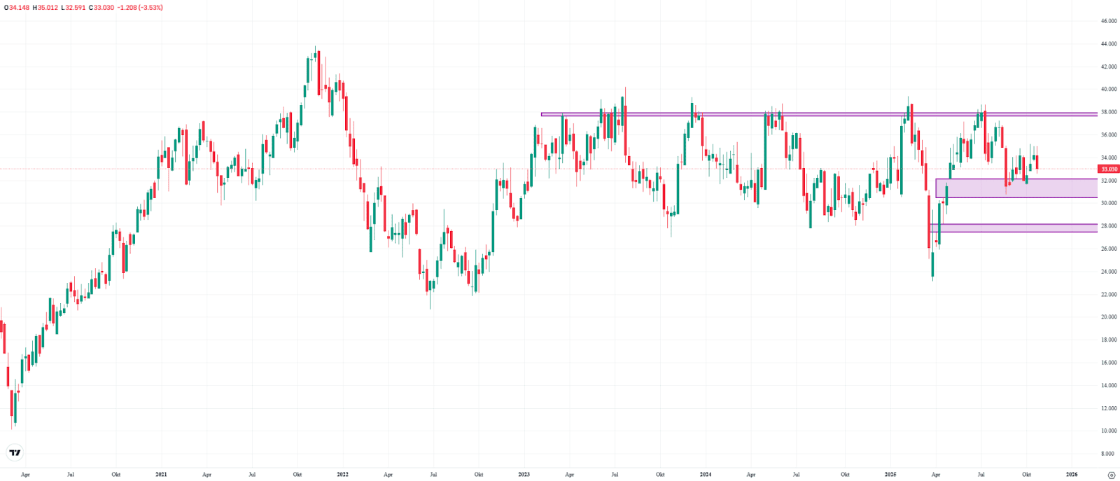 Infineon shares fell about 3.5% last week, currently trading around €33. This halted the three-week recovery phase for now. Since September, the stock has attempted to rebound twice from the support zone between €30.46 and €32.15, but so far it hasn’t managed to test the medium-term resistance at €38. A level that has blocked any sustained move toward record highs since March 2023.