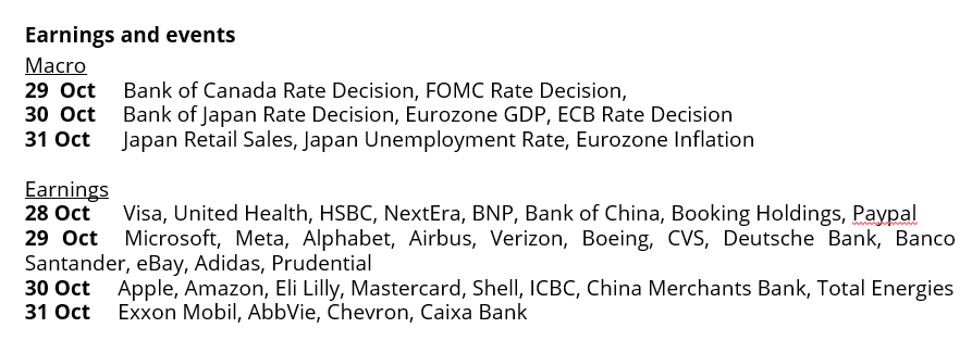 This week could decide whether the bull market keeps charging or pauses for breath. Five giants, Microsoft, Alphabet, Meta, Amazon, and Apple, together make up a quarter of the S&P 500 and will report results mid-week. Overall, 44% of the S&P 500’s market capitalization will be reporting results this week. Investors are zeroed in on their AI strategies: the scale of spending and, crucially, when it starts to pay off. Big Tech’s combined capex could top $420 billion next year, much of it tied to AI infrastructure. So far, revenue growth in cloud and digital ads has justified optimism, but profit growth across the “Magnificent Seven” is slowing from 27% last quarter to about 14%. With valuations stretched, any cracks in the AI or earnings story could test the market’s rally.