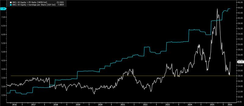 Balance sheet concerns aside, Oracle’s earnings and revenue continue to trend in the right direction. While the stock has been hit by a steep drawdown, the combination of rising earnings expectations and a lower share price has made the valuation more attractive. Notice on the chart above how the forward P/E ratio (white) recently fell to about 18x, with the 18x to 20x range serving as support in recent years. At the same time, earnings estimates (blue) have moved higher, though not without some volatility.