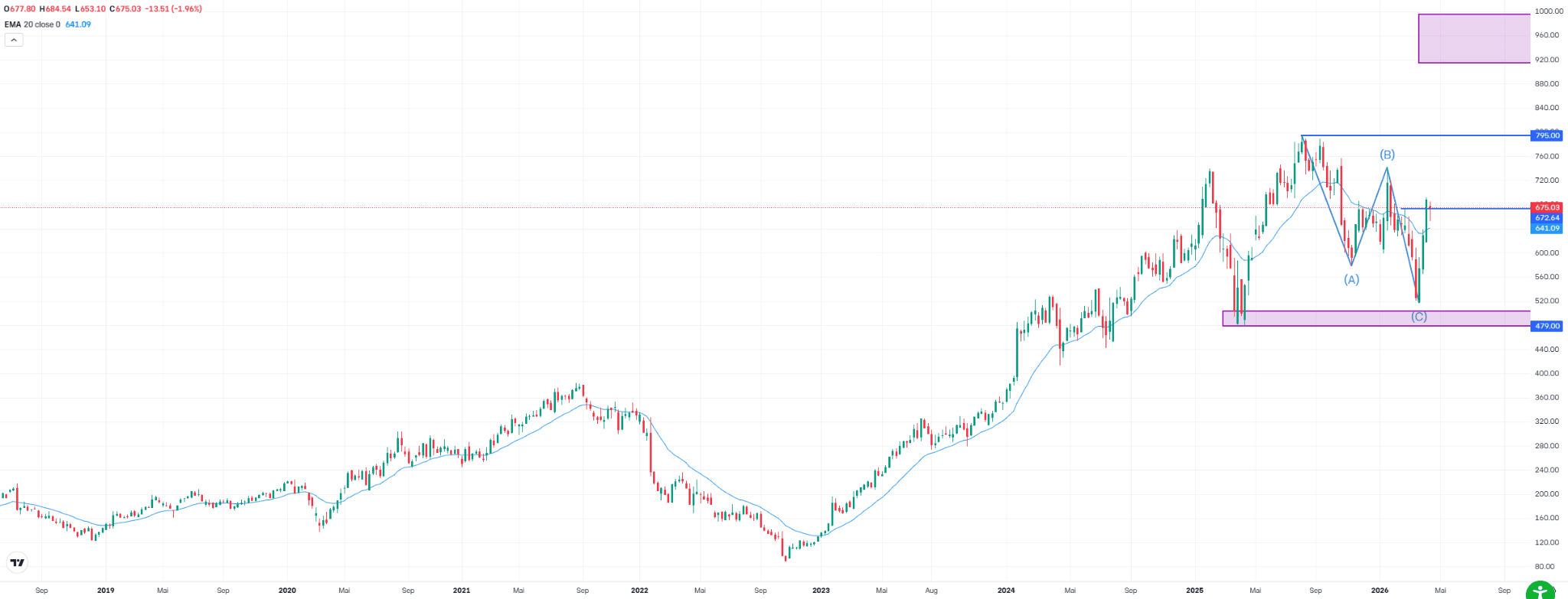 The turnaround occurred near a key support level at $479. Four weeks ago, the stock dropped to $519 before reversing higher. The long-term uptrend therefore remains intact. From a technical perspective, this supports a further move toward the record high. If a breakout occurs, follow through moves toward $915 to $994 dollars are possible, as gains of 15% to 25% are not unusual in such phases. On the downside, the March low at $479 remains the key support level.