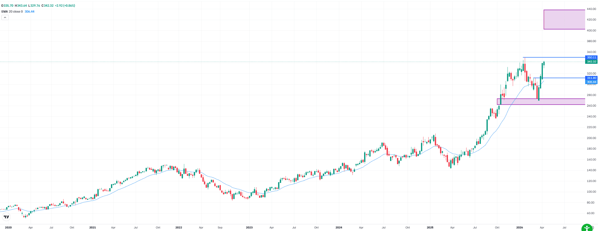 If a breakout to the upside occurs, a medium term follow through move of 15% to 25% would be possible, which is typical in such phases. This implies a potential target zone between $402 and $438. In the event of short-term profit-taking, initial support levels would be at the breakout level around $312 and at the 20-week moving average near $306. The most important support zone, however, lies significantly lower, in the fair value gap between $262 and $273.