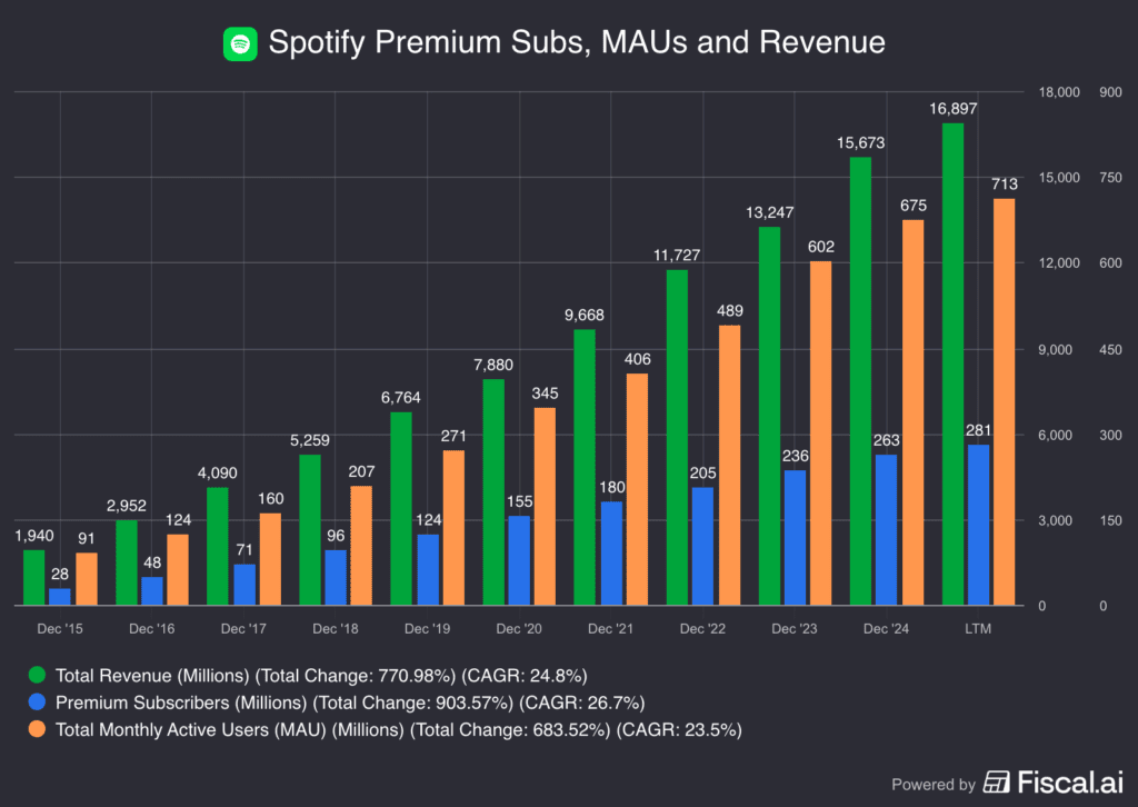 It’s that time of year when Spotify gives us our year-end wrap — so we’re doing one for Spotify itself. As most readers know, Spotify provides audio streaming services worldwide through its Premium and Ad-Supported segments. The company, founded in 2006 and headquartered in Luxembourg, has had a remarkable run as a public business.