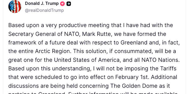 Hallo zusammen 😄 Trump rudert zurück. „Based upon this understanding, I will not be imposing the Tariffs that were scheduled to go into effect on February 1st.“ Vertalen
