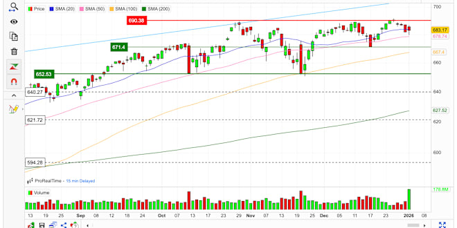 Yesterday SPY closed around 687.7, up slightly on the day and continuing the slow rebound from the early‑January dip while remaining just beneath the long‑standing 690 resistance band and upper channel line. The price action keeps SPY in... Show More