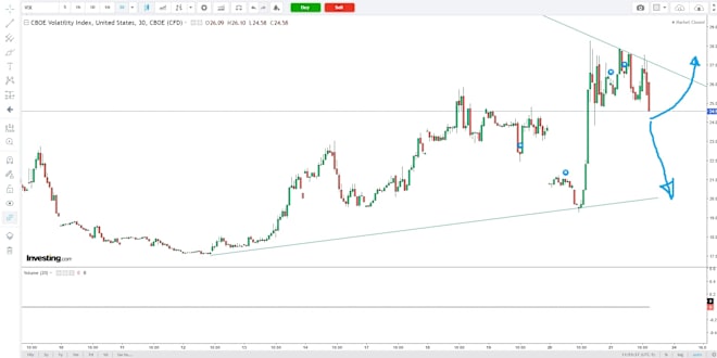 VIX Analysis - How far are we in this correction? Hello dear copiers and followers. I wanted to share a short analysis of this correction looking at the VIX index. The picture is taken from TrendingView. In the graph you can see attached, I drew a triangle that is a typical formation that the VIX... Show More