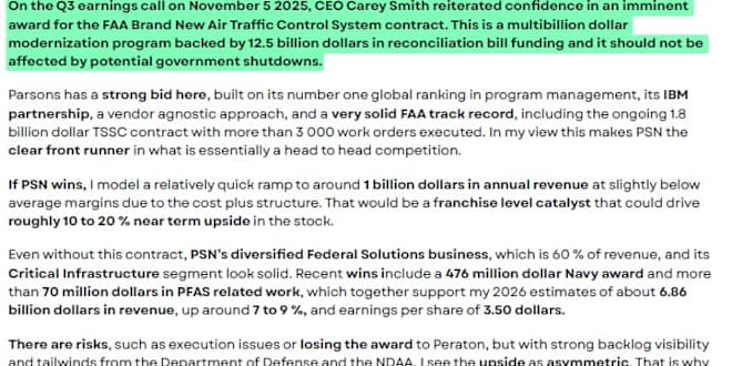Update on our $PSN.US (Parsons Corporation) holding! We currently hold a small position in Parsons (~0.89% of the portfolio). Our thesis for this stake was largely tied to the upside potential of the company securing the FAA’s major integrator award. Today we learned that the $12.5B “Brand New Air... Show More