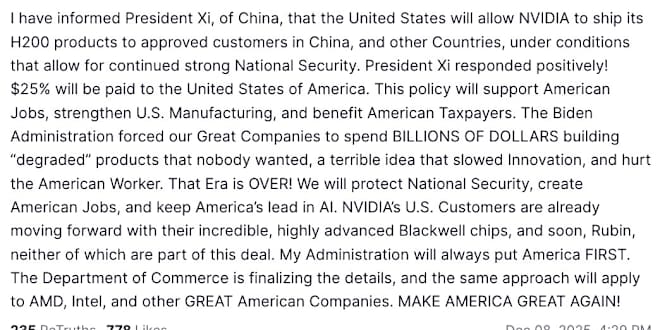 Donald Trump 🇨🇳🇺🇸 I have informed President Xi of China that the United States will allow NVIDIA to ship its H200 products to approved customers in China and other countries, under conditions that ensure strong National Security. President Xi responded positively! 25% will be paid to the United... Show More
