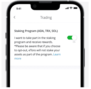 Dacă deții poziții deschise în Cardano (ADA), Tron (TRX), Near Protocol (NEAR), Polygon (POL), Cosmos (ATOM), Polkadot (DOT), Sui (SUI) sau Solana (SOL) și ești eToro (Europa) Ltd utilizatorului, ești supus reglementărilor MiCA și trebuie să te înscrii în mod activ pentru serviciu pentru a-ți pune la staking activele. Accesează Setări > Tranzacționare > Program de staking și mută butonul în poziția ON.**